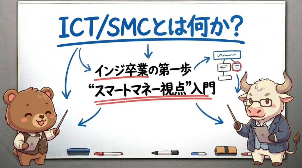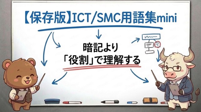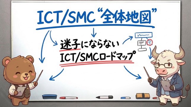 ざっくり言うと、SMCは「概念の集合(構造・流動性・OB・FVGなど)」で、ICTはそれを体系化した“流派”のひとつ、という捉え方がスムーズです。